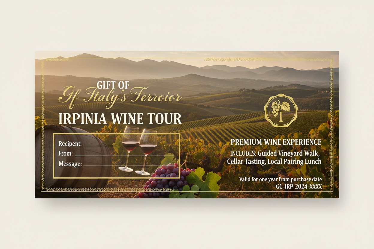 Acquista o Regala la Gift Card per gli amanti del vino. Scopri il territorio dell'Irpinia con i nostri tour enogastronomici esclusivi.